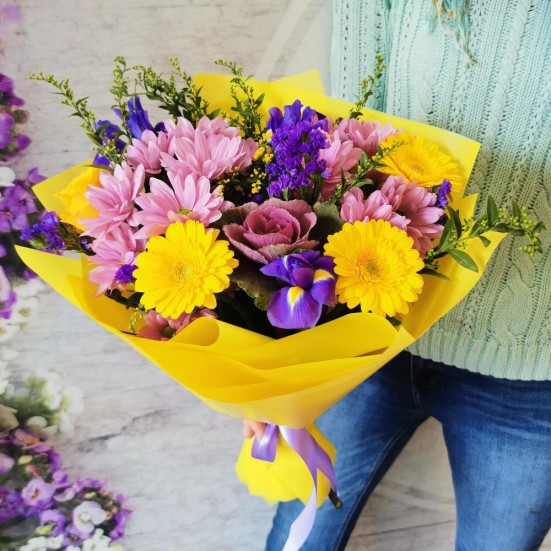 Букет с ирисами и хризантемами и герберами
