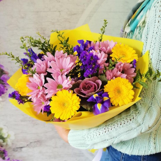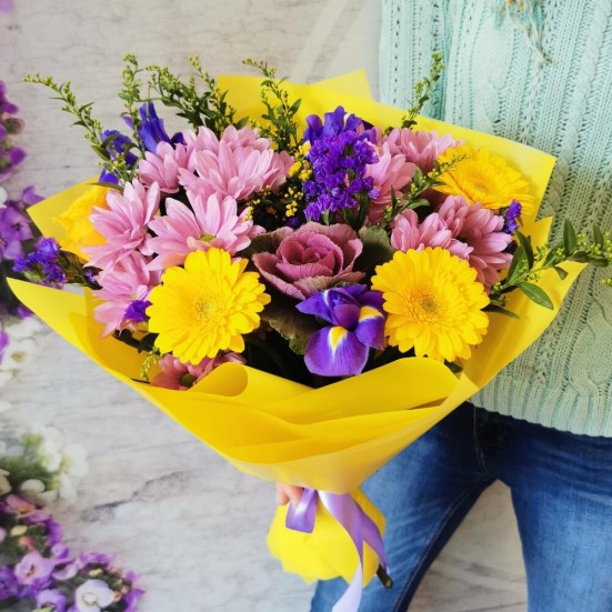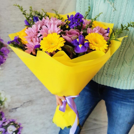 Букет с ирисами и хризантемами и герберами в Барабинске