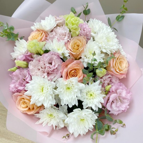 Букет из роз, хризантем, эустомы